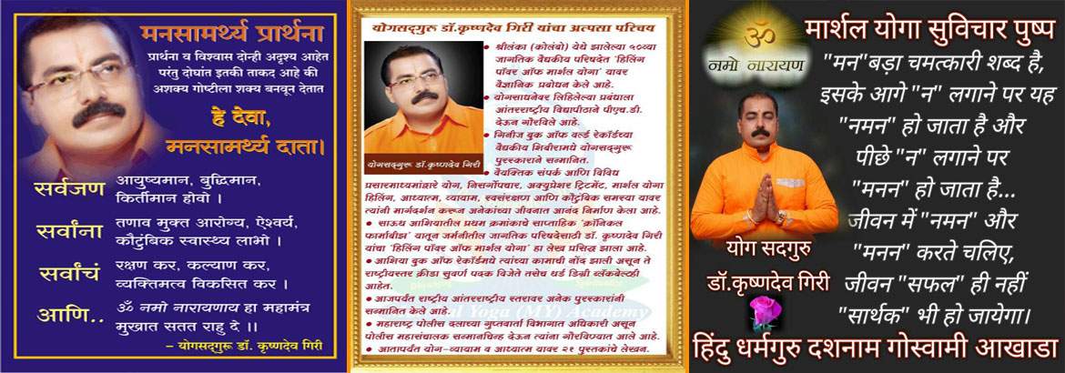 The Science of Yoga is as vast as an ocean. Actual swimming in the water is a unique experience similar is the case of Yoga Shastra. One who has experienced and enjoyed the pleasure of Marshal Yoga, creates a close bond with it. Through this physical , mental and spiritual progress, satisfaction, contentment and peace naturally follows. Then life becomes successful the true sense, says Dr. Giri. Though Marshal Yoga may resemble physical exercises, they are tottaly different. Physical exercises are good but its aim is different. Physical strength and muscular strength are obtained through physical exercise but Marshal Yoga not only give importance to body but also to mind, life energy and their healthy states.