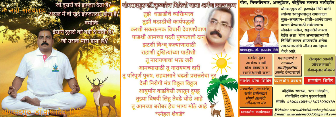 Dr Giri is working as an officer with the Maharashtra Police Intelligence Department. Even while doing his duties, he is engaged in the propagation of yoga, natural remedies, acupressure, astrology and several healing systems.